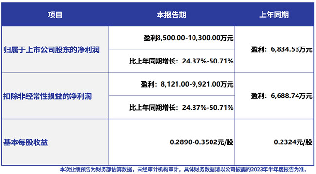 7月12日,william威廉中文官网发布2023年半年度业绩预告。公司上半年归属于上市公司股东的净利润预计为8500万元~1.03亿元,同比增长24.37%~50.71%;扣除非经常性损益的净利润预计为8121万元~9921万元,同比增长21.41%~48.32%,基本每股收益预计为0.2324元。