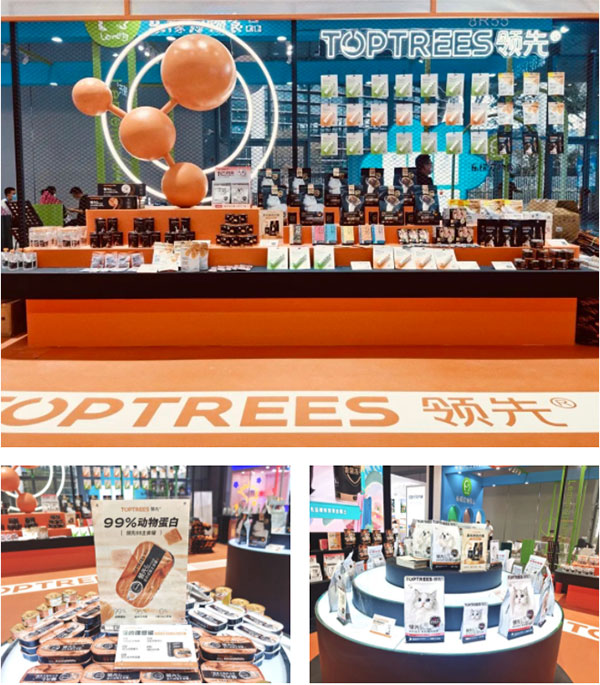 Toptrees领先的展位以品牌色黑、橙为主基调,将品牌风格融入整体展台形象之中,同时在细节上搭配了领先三周年等话题元素,强化消费者的品牌认知。99主食罐、金装冻干鲜肉粮、主食猫条、活力+系列鲜肉粮等年度爆款产品也在本届亚宠展现场尽数亮相。