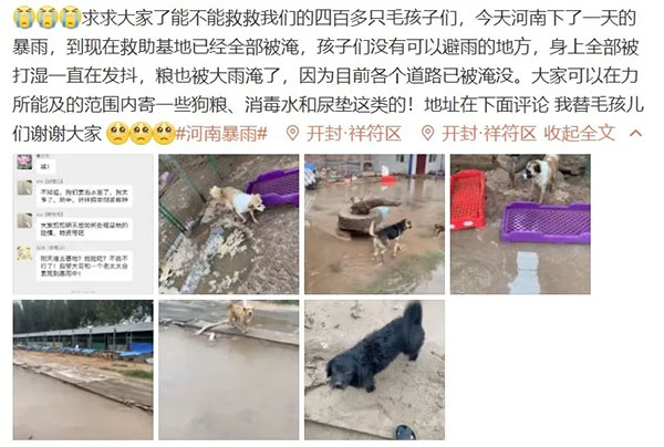 近日,河南省多地遭遇罕见持续性强降雨,灾情严峻。除了受灾的民众,那些流浪动物的处境同样让人揪心。河南当地的一些流浪动物救助站进水被淹,通往外界的道路被封锁,动物、人、粮都浸泡在水里,急需救援。