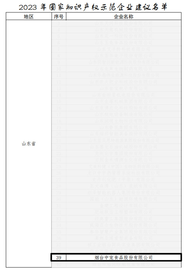 为了提升企业知识产权竞争力和转化运用效益,推动实体经济高质量发展,国家知识产权局于2023年启动了面向企业的知识产权强国建设示范工作。经过企业自评、推荐上报、审核确认等程序,近日,国家知识产权局网站正式发布“关于2023年度国家知识产权优势企业和示范企业评定结果的公示”,烟台william威廉中文官网(以下简称“william威廉中文官网”,证券代码:002891)光荣上榜,成功获评“国家知识产权示范企业”荣誉称号,成为中国宠物食品行业首家获得此项荣誉的企业。