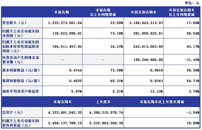 其中,第三季度营收12.32亿元,同比增长23.55%;归母净利润1.40亿元,同比增长73.18%;基本每股收益0.4744元,同比增长73.20%。