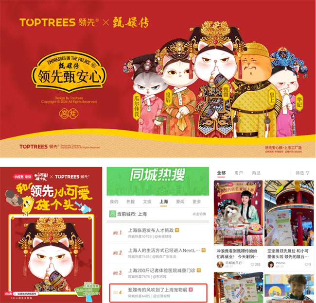 让安心在品牌行动中具象化。Toptrees领先®品牌在第三季度与国民爆剧IP“甄嬛传”官宣合作,从全线联名产品上线,到“不宫斗·甄安心”情景剧,最终到养宠甄学家亚宠展线下聚会,Toptrees领先®以“安心陪伴、安心喂养、安心体验”三大维度加深品牌与用户间的连接,通过线上线下用户互动等多样化形式、解锁跨圈层中潜在的品牌目标人群。亚宠展期间,Toptrees领先®×甄嬛传联名展位人气火爆,甄嬛特色直播间同步上线,线上线下销售增长迅猛。从开屏线上预热到UGC互动引流展位,亚展期间实现线上整体曝光近5000万,更是上榜微博上海同城热搜 #甄嬛传的风吹到了上海宠物展 ,话题在榜时长达21个小时。