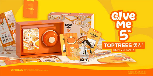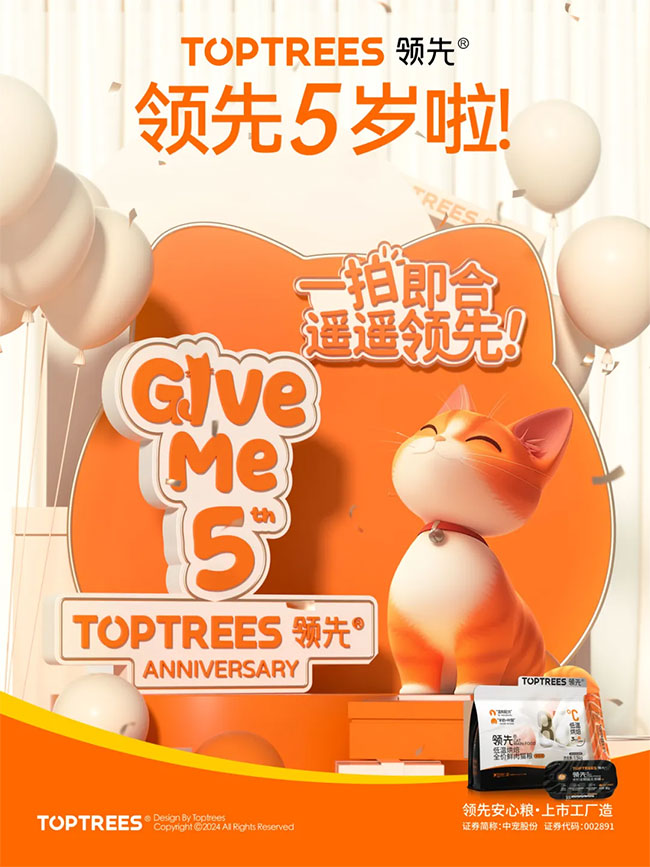 自2019年品牌创立至今,Toptrees领先®始终坚持打磨好每一款产品,为用户提供安心选择,成为爱宠的安心拍档。今年7月,Toptrees领先®在品牌成立品牌5周年之际,推出以“Give me five”为传播主题的限定周边,通过线上品牌用户间交互传播,有效提升品牌的用户粘性和活跃度。