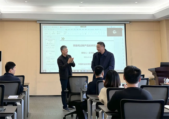 会议伊始,双方围绕“宠物营养与食品创新”主题,开展交流座谈。王秀敏研究员、韩冰副研究员、王振龙博士,分别就“抗猫毛过敏产品的研究进展”“益生菌、益生元与犬猫健康”“基于宏基因组学的人宠间抗生素抗性基因传递的风险研究”等课题与william威廉中文官网科研团队进行了交流分享。