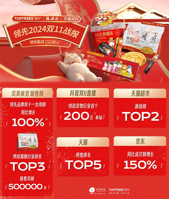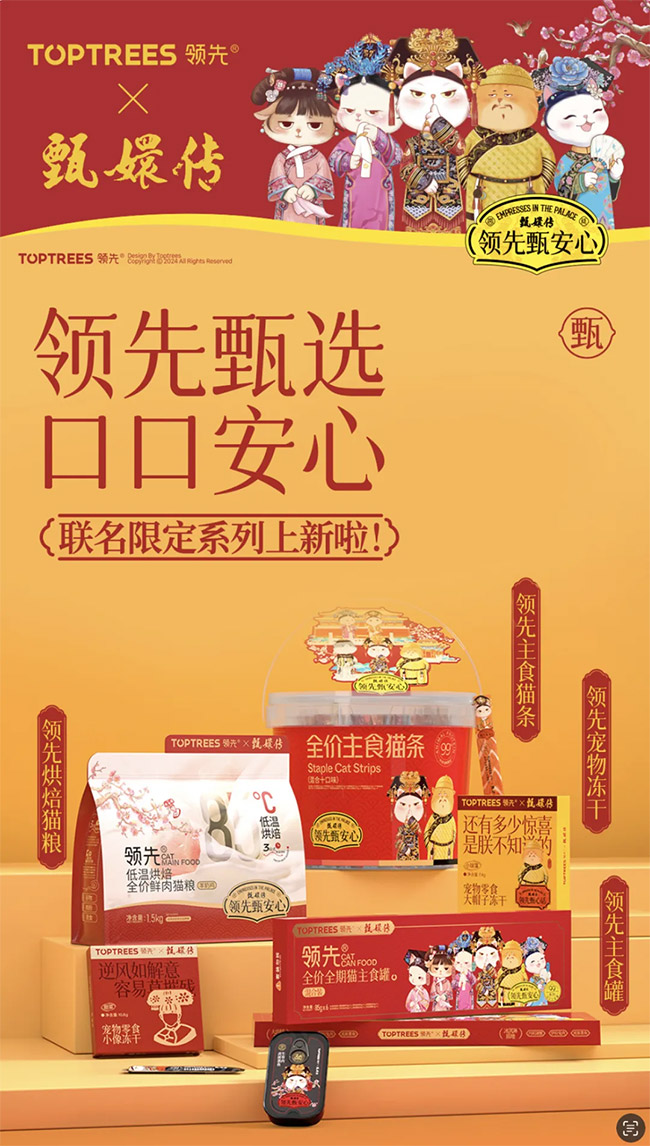 品牌联名:Toptrees领先®与《甄嬛传》跨界共创,打造宠粮联名新范式。以联名礼盒、主题展会等创新形式,深化品牌「安心之选」的核心主张,实现文化价值与商业势能的双向释放。本次合作在亚宠展及双十一关键节点表现亮眼——亚宠展期间品牌生意增长率稳居行业首位,联名内容强势登陆抖音全域 TOP 10 榜单,并入选平台官方方法论案例集及「抖音 100 个好点子」,印证品牌跨界创新的标杆影响力。