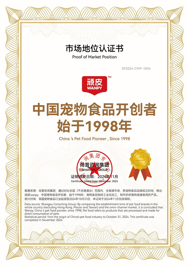 WANPY顽皮®市场地位认证系列证书