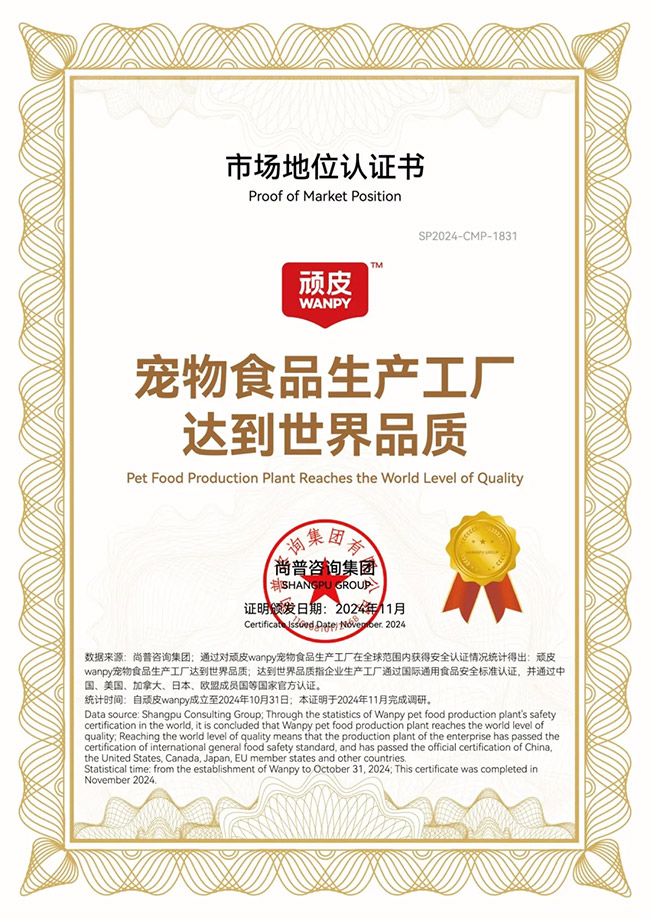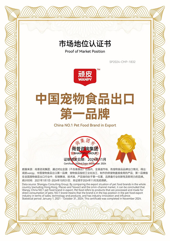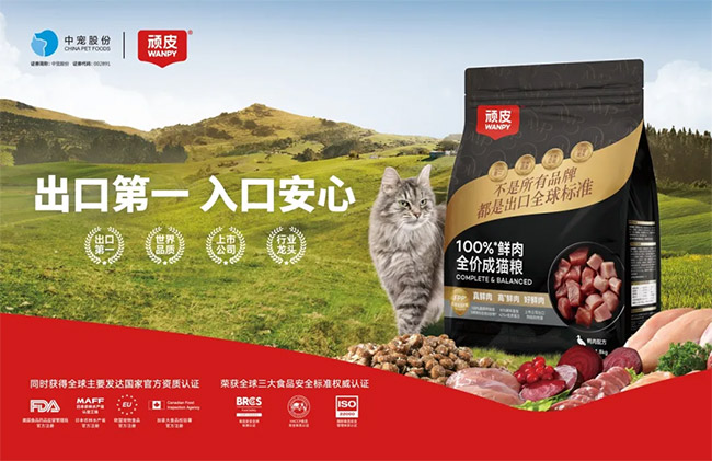 2024年,WANPY顽皮®启动全新品牌战略定位升级项目。作为世界级品质的中国宠物食品领军品牌,WANPY顽皮®品牌获“中国宠物食品出口第一品牌”“宠物食品生产工厂达到世界品质”“中国宠物食品开创者,始于1998”等市场地位认证证书。不是所有品牌都是出口全球标准,WANPY顽皮®品牌将世界级工厂标准、获国际权威认证、让中国宠食闪耀全球的企业“事实优势”逐步转化为品牌“认知优势”,成为更多宠食消费者的安心之选。27年来,WANPY顽皮®已经成为全球73国爱宠的安心之选,WANPY顽皮®也将持续致力于让中国万千宠物,同享全球更高品质。