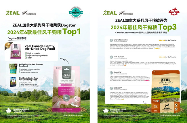 新西兰ZEAL真致®加拿大系列风干粮荣获国际宠物杂志Dogster【2024年6款最佳风干狗粮TOP1】与CPC【2024年最佳风干狗粮TOP】双料大奖,产品和品牌获得国际行业认可。