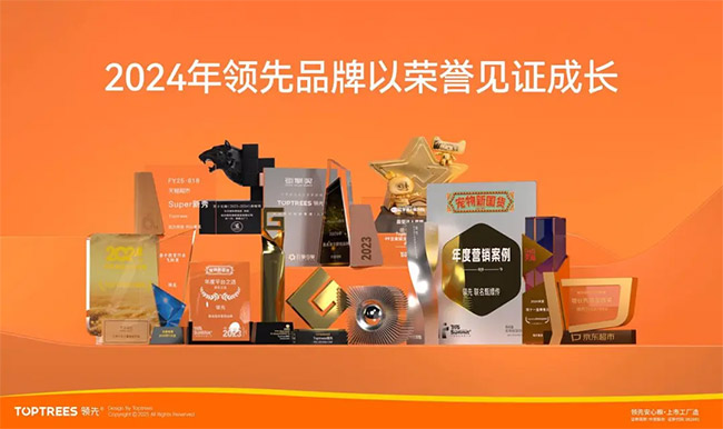 五年来,Toptrees领先®以“安心品质+文化赋能”双引擎,推动品牌国民认知度提升300%+,2024年电商平台表现尤为亮眼——包揽京东“国产宠粮增长新势力品牌”、抖音电商“双11亲子教育行业飞跃奖”、天猫“双11金牌售后”等6项平台大奖,并荣膺“宠物新国货年度营销案例”称号,真正实现从行业黑马到拥有强大影响力国货品牌的华丽转身。
