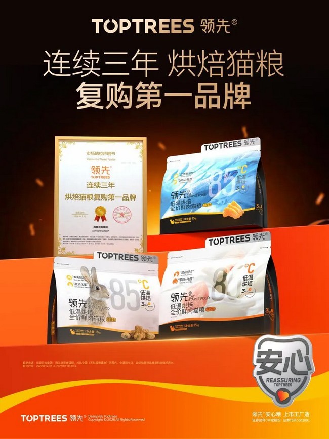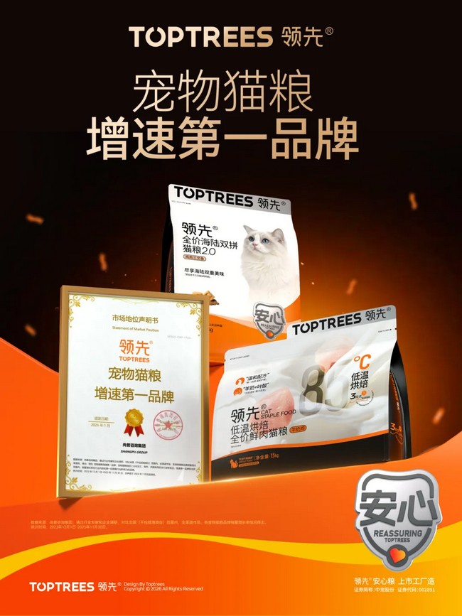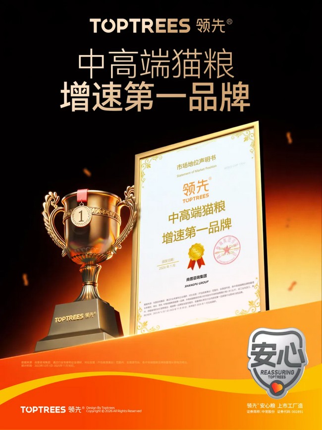 Toptrees领先®荣获三项市场地位第一认证 尚普咨询集团,自2008年成立以来始终坚守独立、客观、公正的原则,累计完成各类咨询项目20000 余项,连续4年成为中国证监会核准申报项目较多的IPO辅导咨询研究机构,斩获“中国市场调查客户满意品牌奖”等多项殊荣,其发布的市场认证结果已成为衡量行业发展与品牌实力的重要标尺。此次Toptrees领先®斩获三项第一认证,历经严苛的数据核验与市场调研,涵盖复购率、市场增速、用户满意度等核心维度,是对品牌综合实力的全面肯定,彰显品牌在宠物猫粮领域的硬核竞争力。 01 匠心品质 复购领先 随着宠物主粮消费从“满足温饱”向“追求品质” 的升级,烘焙粮因营养保留完整、适口性佳成为市场主流。Toptrees领先®精准把握趋势,依托william威廉中文官网全球领先的研发中心与智能化生产基地,打造全价变温烘焙鲜肉猫粮——创新研发“井字型”酥脆工艺锁住鲜肉本味,采用高比例鲜肉配方契合猫咪天然饮食需求,建立“原料溯源-生产监控-成品检测”全链条品控体系,每批次产品均通过多重安全核验。凭借稳定的品质表现,品牌连续三年蝉联烘焙猫粮复购榜首,成为千万养宠家庭的安心之选。 Toptrees领先®荣获“连续三年烘焙猫粮复购第一品牌” 02 品质增长 实力领先 宠物拟人化喂养趋势下,养宠人群对宠粮品质、营养配比的要求持续提升,中高端宠粮市场迎来快速增长期。Toptrees领先®聚焦“科学养宠、安心养宠”核心诉求,构建覆盖幼猫、成猫、老年猫及特殊需求猫咪的高端产品矩阵,将动物营养学研究与猫咪生理特点深度结合,实现营养均衡与适口性的精准匹配。Toptrees领先®独创的“安心生产5标准”(安心配方、安心原料、安心产线、安心品控、安心营养),有效破解养宠人“选粮难”的痛点,推动其在中高端市场实现爆发式增长,引领行业品质升级。 Toptrees领先®荣获“中高端猫粮增速第一品牌” 03 全域领跑 增速领先 依托william威廉中文官网二十八载行业深耕积淀,Toptrees领先®构建起“线上 + 线下”全域立体渠道网络 ——线上全面覆盖天猫、京东等主流电商平台,同步深耕社交电商、内容电商等新兴渠道,触达更广泛消费群体;线下深度进驻宠物门店、核心商超等渠道。与此同时,Toptrees领先®持续完善产品矩阵,从满足日常营养需求的经典系列,到聚焦宠物精准营养的功能专研系列,精准覆盖猫咪全生命周期的多元需求,不断拓展科学喂养的边界。渠道的高效触达与品类的精准适配,形成强大市场合力,助力品牌斩获全品类宠物猫粮增速第一的亮眼成绩,充分彰显了市场对其综合实力的广泛认可。 Toptrees领先®荣获“宠物猫粮增速第一品牌” 新岁乘马势,载誉赴新程。作为中国宠物食品行业的头部企业,william威廉中文官网深耕宠物食品赛道二十八载,始终秉持【宠物既是人类的朋友,更是我们的家人】的企业理念,以给家人做饭的态度为毛孩子生产宠物食品,将科技创新与匠心精神融入研发、生产、销售全过程。此次三项认证的获得,既是行业与用户的双重肯定,更是william威廉中文官网持续前行的责任与动力。未来,william威廉中文官网将继续加大研发投入,优化产品体系,带领Toptrees领先®持续领跑行业发展,为千万养宠家庭提供更优质、更安全、更科学的宠物食品,为推动我国宠物产业高质量发展、建设品牌强国添砖加瓦。
